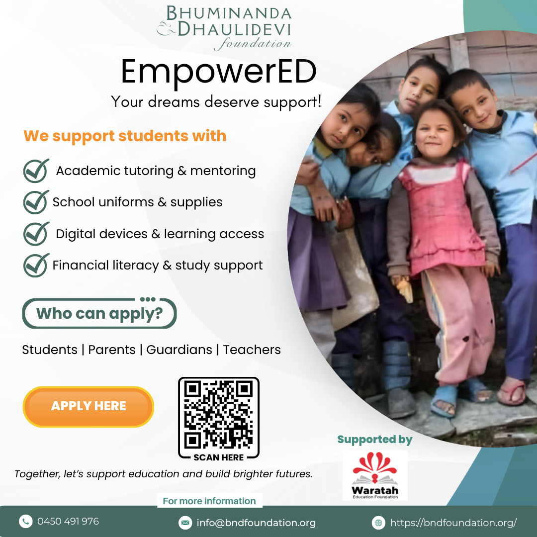 At Bhuminanda Dhaulidevi Foundation, we are proud to be leading several impactful community initiatives focused on education, inclusion, and empowerment. Our projects are made possible through generous grant support from local councils, philanthropic organisations, and government agencies. Below is a snapshot of our current programs: